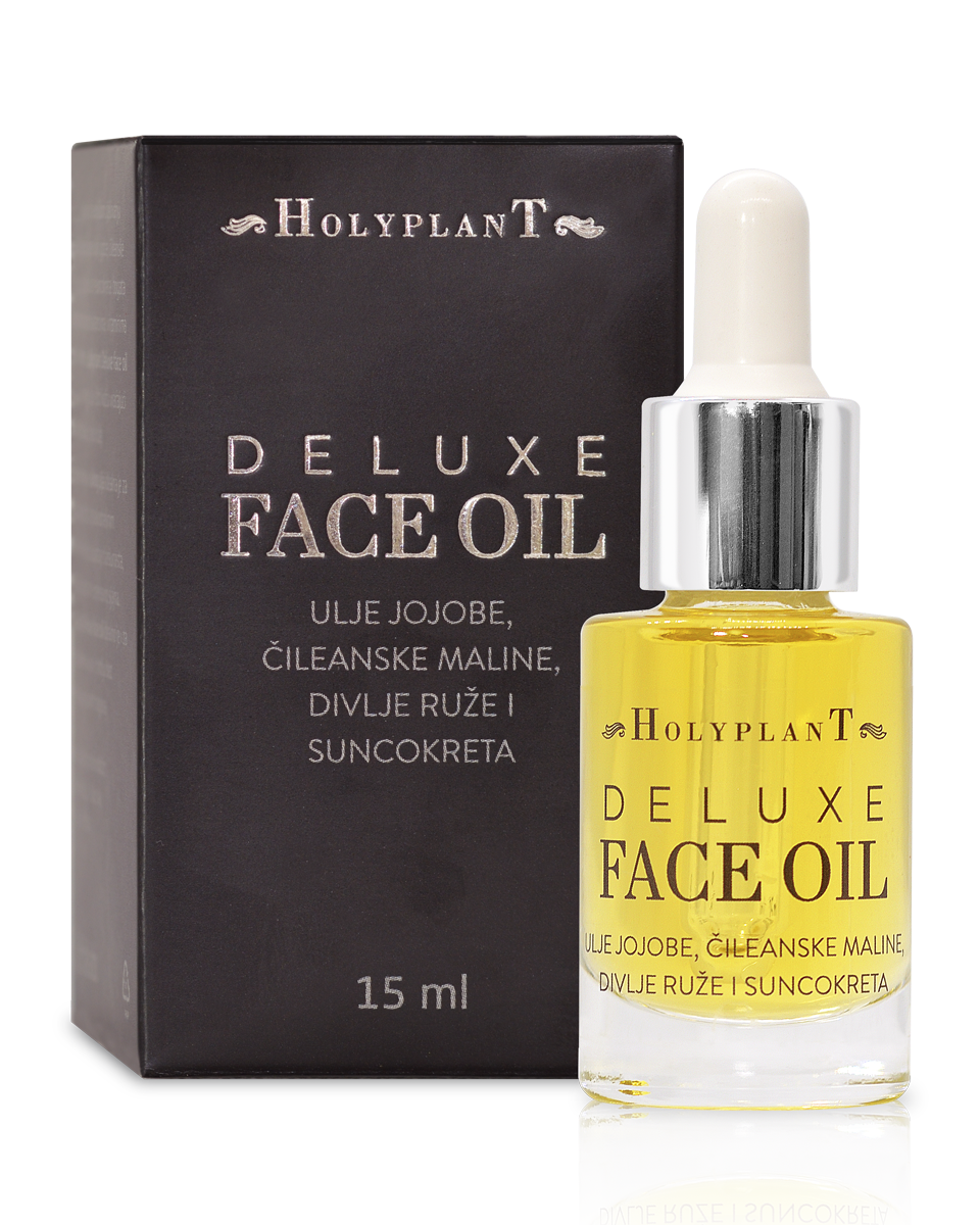 HOLYPLANT DELUXE FACE OIL zahvaljujući zajedničkom djelovanju četiri dragocjena ulja, jojobe, čileanske maline, divlje ruže i suncokreta, bogata potrebnim antioskidantima, vitaminima i nutrijentima, Holyplant Deluxe face oil dubinski hrani, jača i štiti kožu vraćajući tonus i zdrav izgled kože. Lagana formula suhog ulja idealna je za sve tipove kože. Holyplant Deluxe face oil idealno je i za njegu kose i noktiju bez ostavljanja masnih tragova.