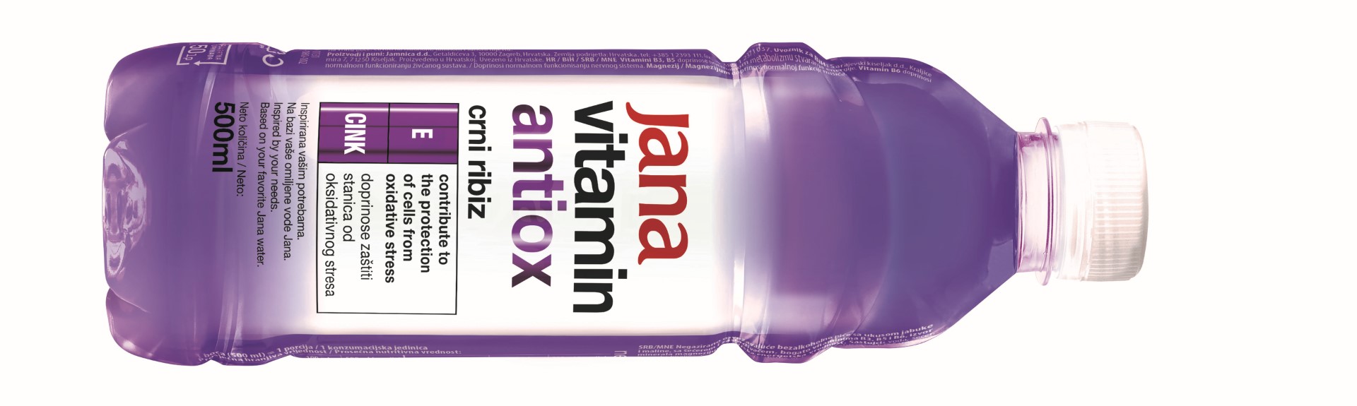 Jana vitamin antiox najnovija je predstavnica palete Jana vitamin koja u osvježavajućem okusu crnog ribiza donosi značajan udio dnevnih potreba za vitaminom E i mineralom cinkom. Ovi aktivni sastojci doprinose zaštiti stanica od oksidativnog stresa, donoseći time blagotvoran učinak za zdravlje.