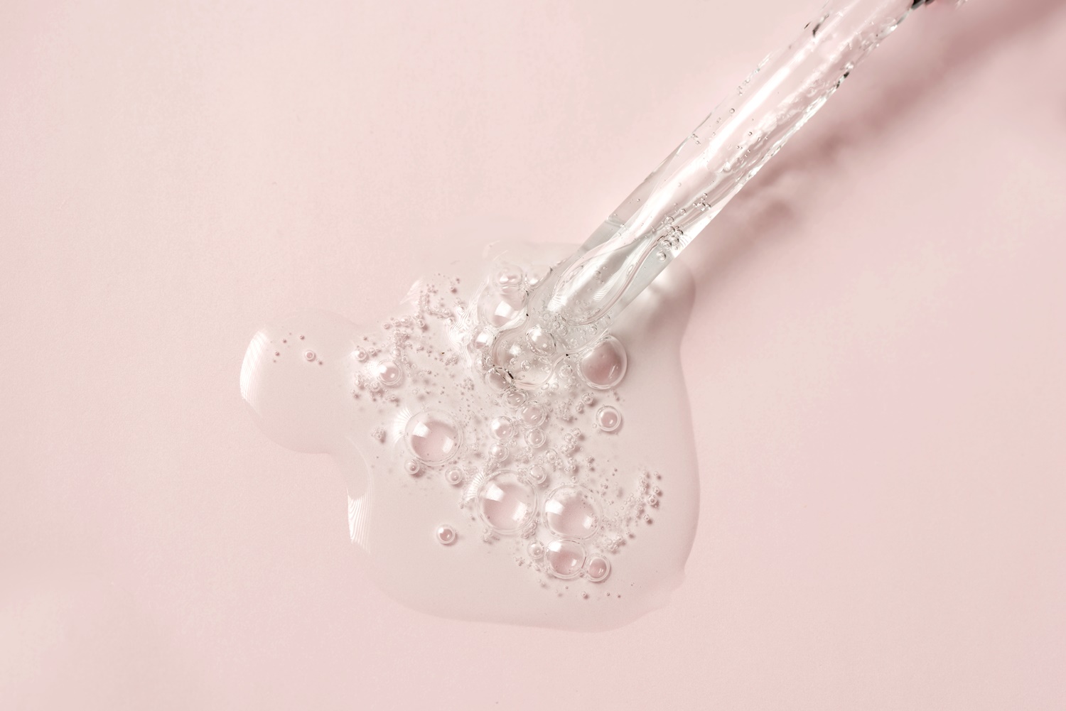 Liquid oil serum drop in pipette isolated on pastel pink background. Retinol, aha, bha acid, collagen skincare fluid, photo with shallow depth of field. Gold essence in dropper for beauty treatment.