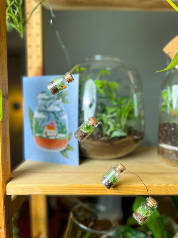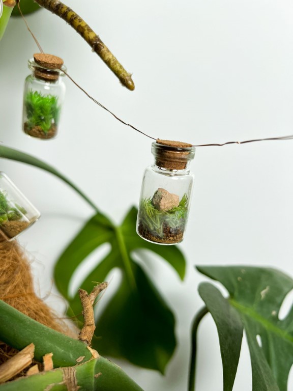 Lampice su dugačke dva metra te sadrže 20 terarija. Svaka staklenka nudi dom zelenoj polarnoj mahovini.