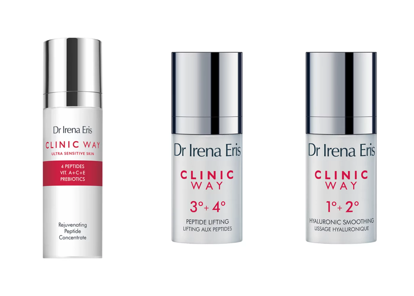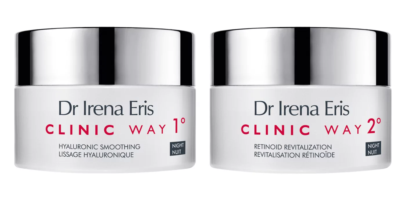 Ako samo želite promijeniti svakodnevnu kremu, Dr. Irena Eris se potrudila razviti 3 linije krema za dnevnu i noćnu njegu te ih je podijelila po dobnim skupinama. Clinic Way 1° sa zaglađujućim algama je za žene u 30 – tima kada se prirodno smanjuje razina hijaluronske kiseline u koži te pomaže u njezi prvih finih bora koje su povezane s mimikom lica. Kada pređete 30 – tu na red dolazi Clinic Way 2°, linija bogata retinoidima. Linija se zahvaljujući jedinstvenim sastojcima bori protiv procesa odgovornih za nastanak elastičnih bora. Stručni i znanstveni tim Dr. Irene Eris pobrinuo se i za žene u 50 – tima svojom Clinic Way 3° linijom. Posebnost krema iz ove linije je što uz fitohormonsko pomlađivanje imaju učinke protiv atrofičnih bora. Sve 3 linije sastoje se od dnevne i noćne kreme stoga u kombinaciji čine praktičnu i djelotvornu svakodnevnu rutinu njege zrele kože.