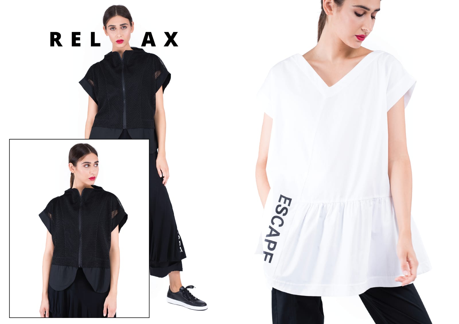 Početna ideja i ime za kolekciju ESCAPE inspirirana je ciklusom slika naše konceptualne umjetnice Ljiljane Mihaljević, koja je i sama riječ ESCAPE koristila u svojim djelima igrajući se njezinim grafizmom.