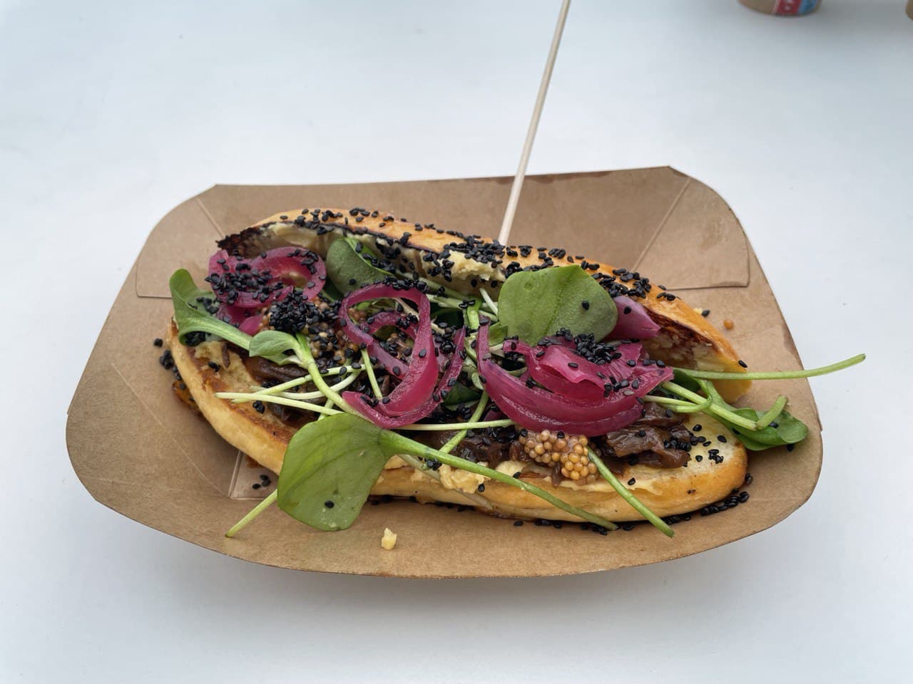 Moj dojam: Pecivo je vrlo mekano, gljive su lagano pokupile kiselinu od luka, humus je lagan i ne preuzima okuse, ali je suptilni suradnik i idealno raspoređen posvuda da nema nimalo suhoće. Dapače, jako ukusan i sočan.