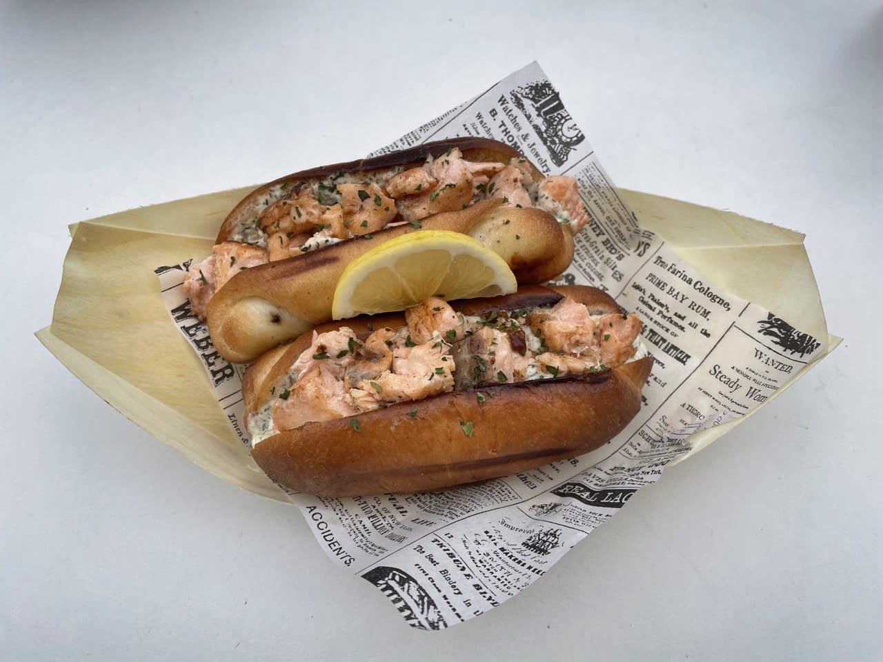 (Grillani premium losos poslužen u mekanom brioche pecivu s umakom na bazi vrhnja, uz dodatak mrkve, celera i kiselih krastavaca)