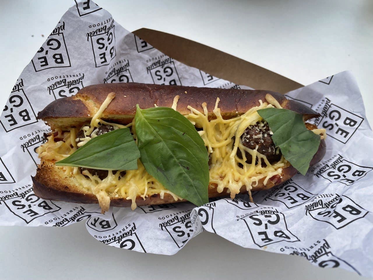 (Mesne okruglice beyond meat, hot dog pecivo od kroštule plant-based, domaća šalša, posip od veganskog sira, zapečeno u pećnici, svježi bosiljak)