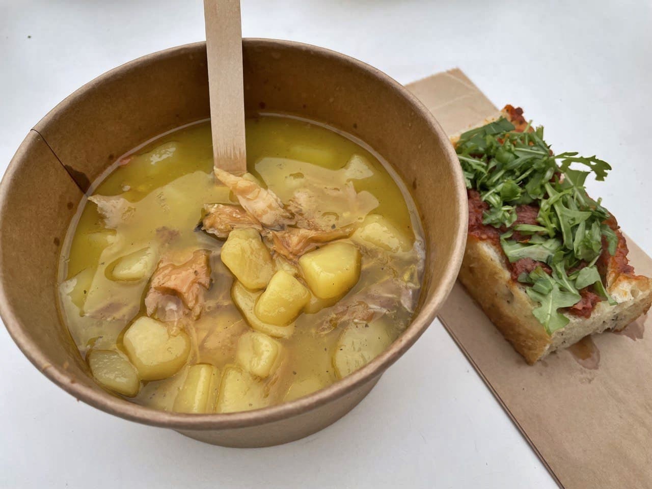 Moj dojam: Receptura baš poput domaće, nježna juhica blagih okusa, krumpir mekan, bakalar blago suh, focaccia hrskava izvana, meka iznutra.