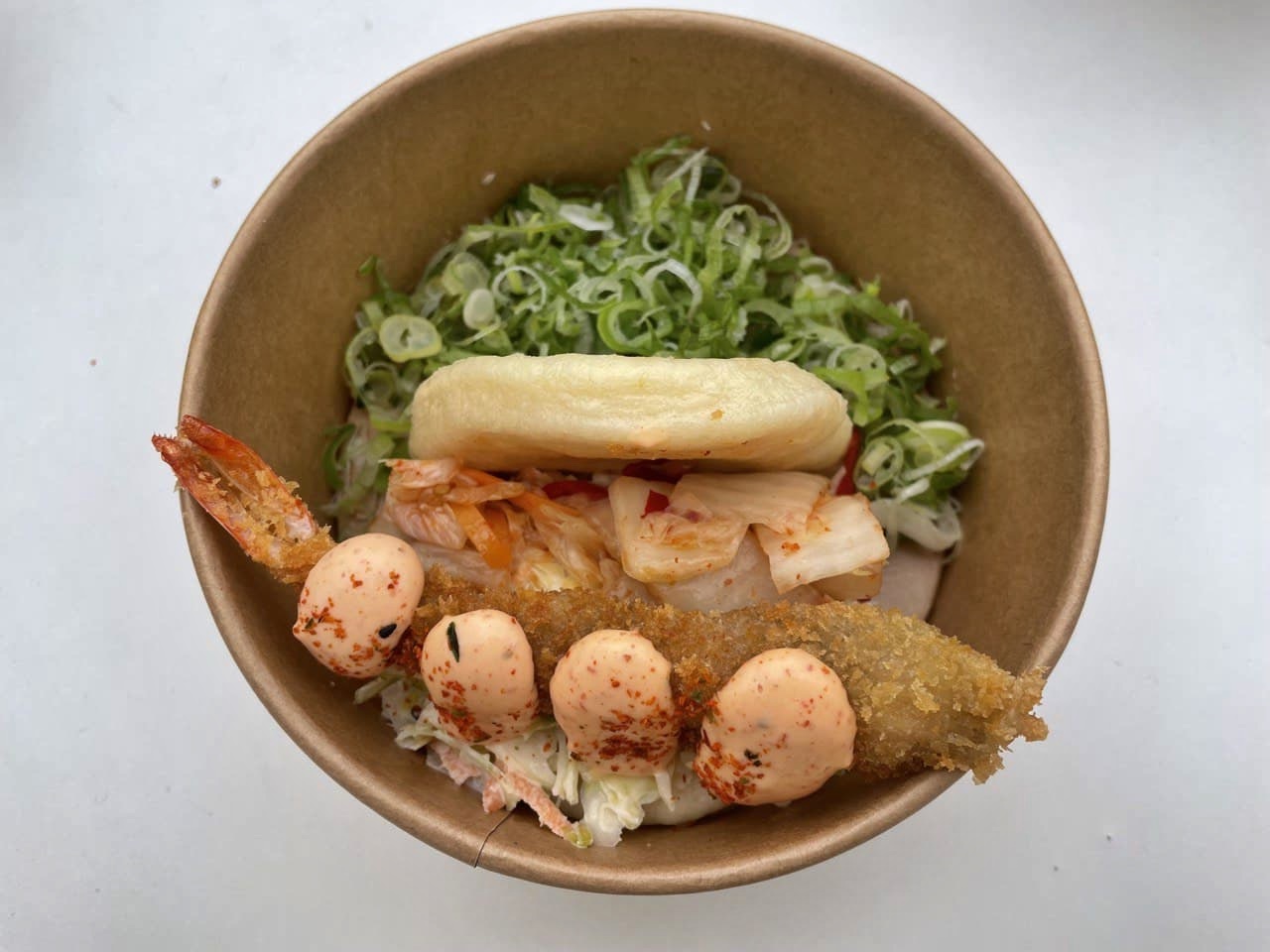 (Tijesto na pari na bazi rižinog brašna, mlijeka i kardamoma, kozica u tempura, cold slow salata, kimchi)