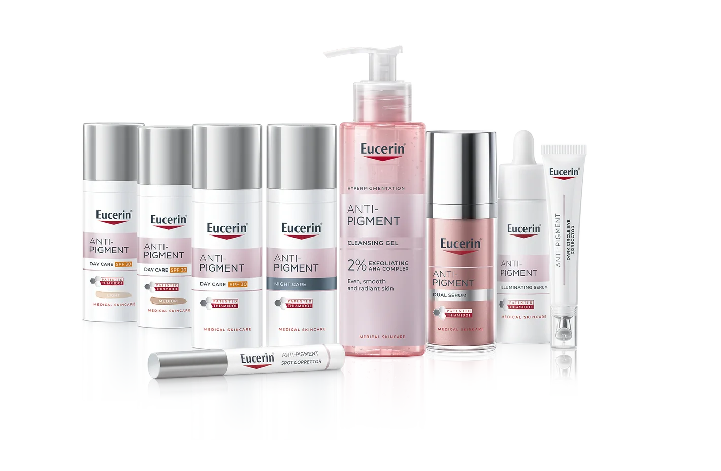 Eucerin Anti-Pigment njega posebno je formulirana kako bi smanjila hiperpigmentaciju za ujednačeniju i sjajniju kožu. Najnoviji dodatak Eucerin Anti-Pigment liniji za njegu kože protiv hiperpigmentacije je Eucerin Anti-Pigment gel za čišćenje s 2% AHA kompleksom, koji kombinira ključne aktivne sastojke za učinkovito smanjenje hiperpigmentacije i poticanje obnavljanja kože.
