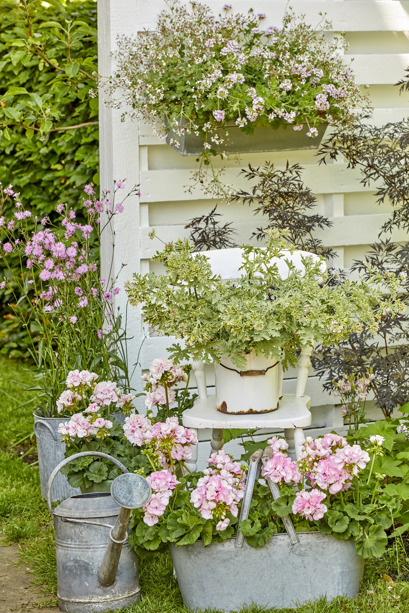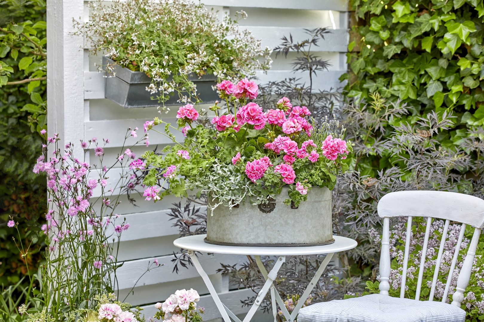 Veličanstvene pelargonije u nježnim, pastelnim nijansama dominiraju ovim romantičnim, Shabby Chic vrtnim rajem. Na stolici i uz drveni zid, pelargonije imaju intenzivan miris, dok nježna ružičasta boja prekrasnih, uspravnih pelargonija čini upečatljiv kontrast s metalik sivom bojom ukrasnih predmeta od cinka.