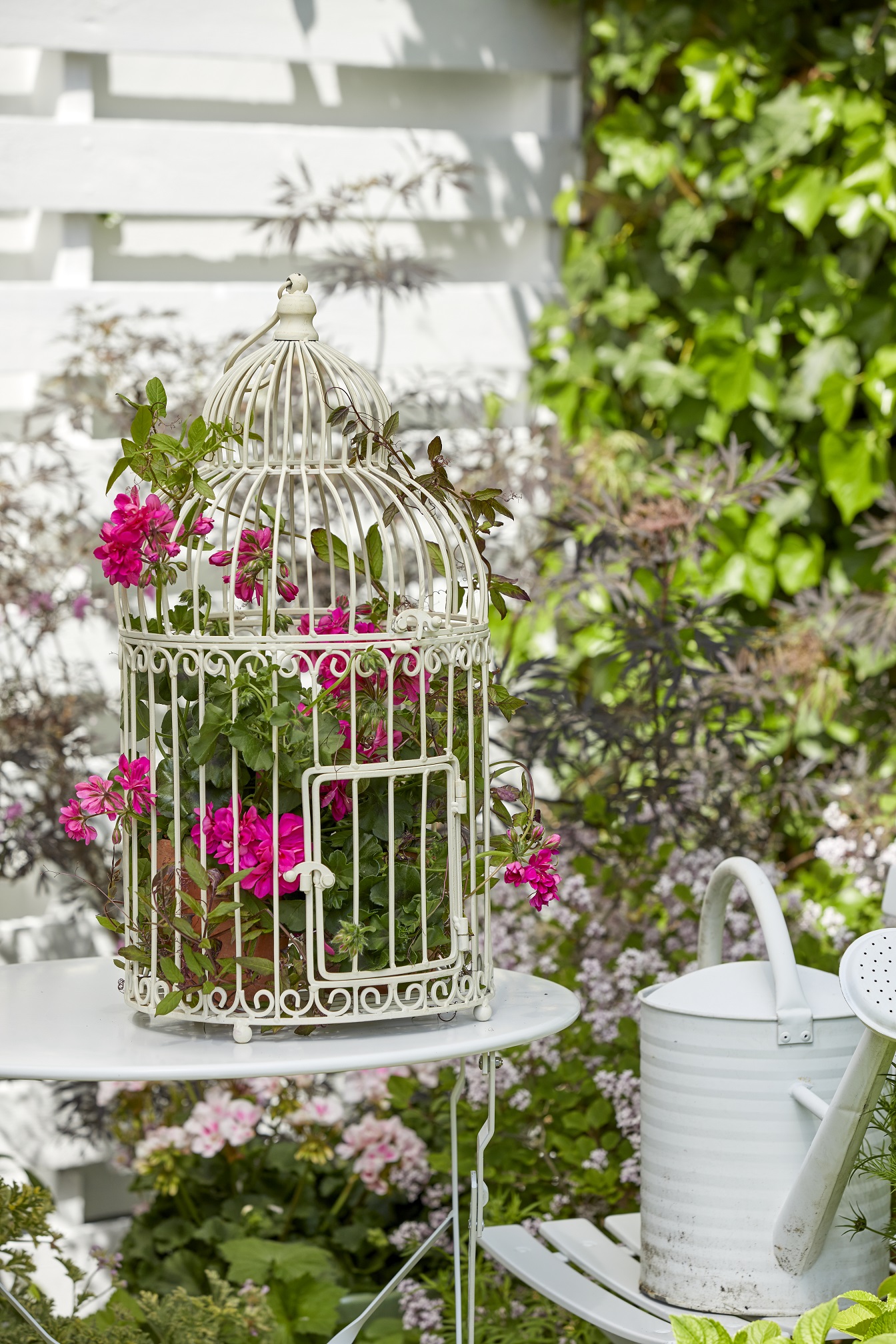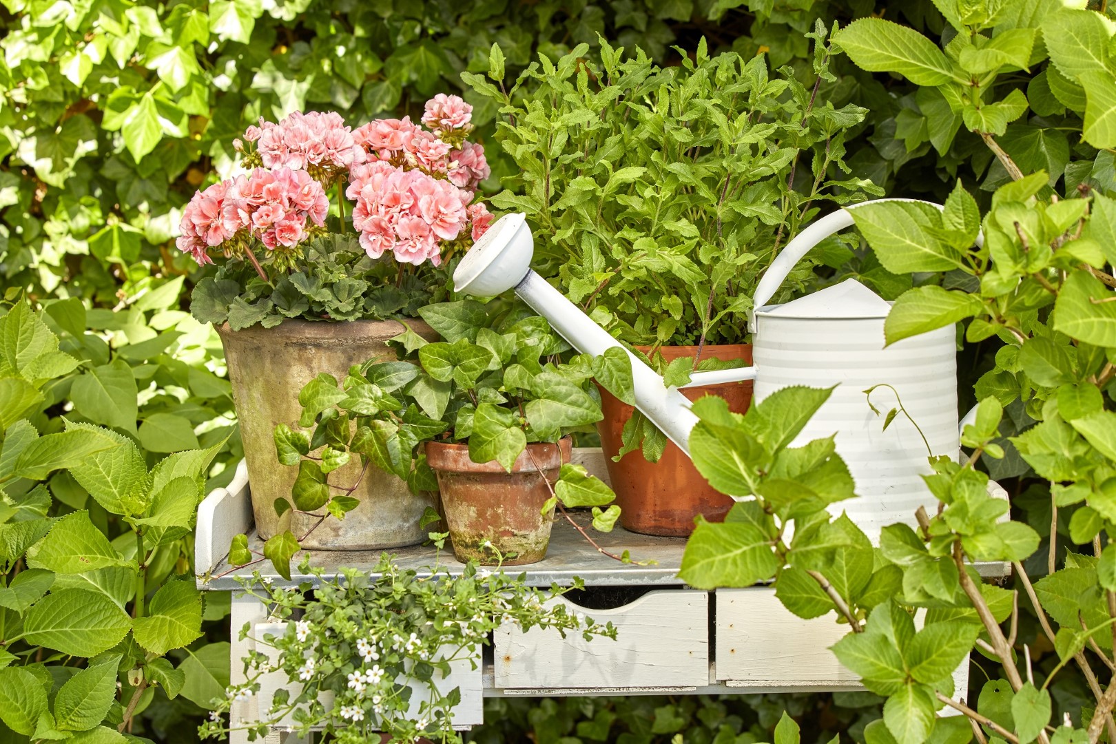 Ova bijela drvena komoda imala je i boljih dana. Ipak, okružena bujnim zelenilom, čini atraktivan dio vrta u kojem bujna ružičasta pelargonija u atraktivnoj posudi od terakote, zajedno s bršljanom, začinskim biljem i bijelom metalnom kantom za zalijevanje predstavlja ljupki prizor.
