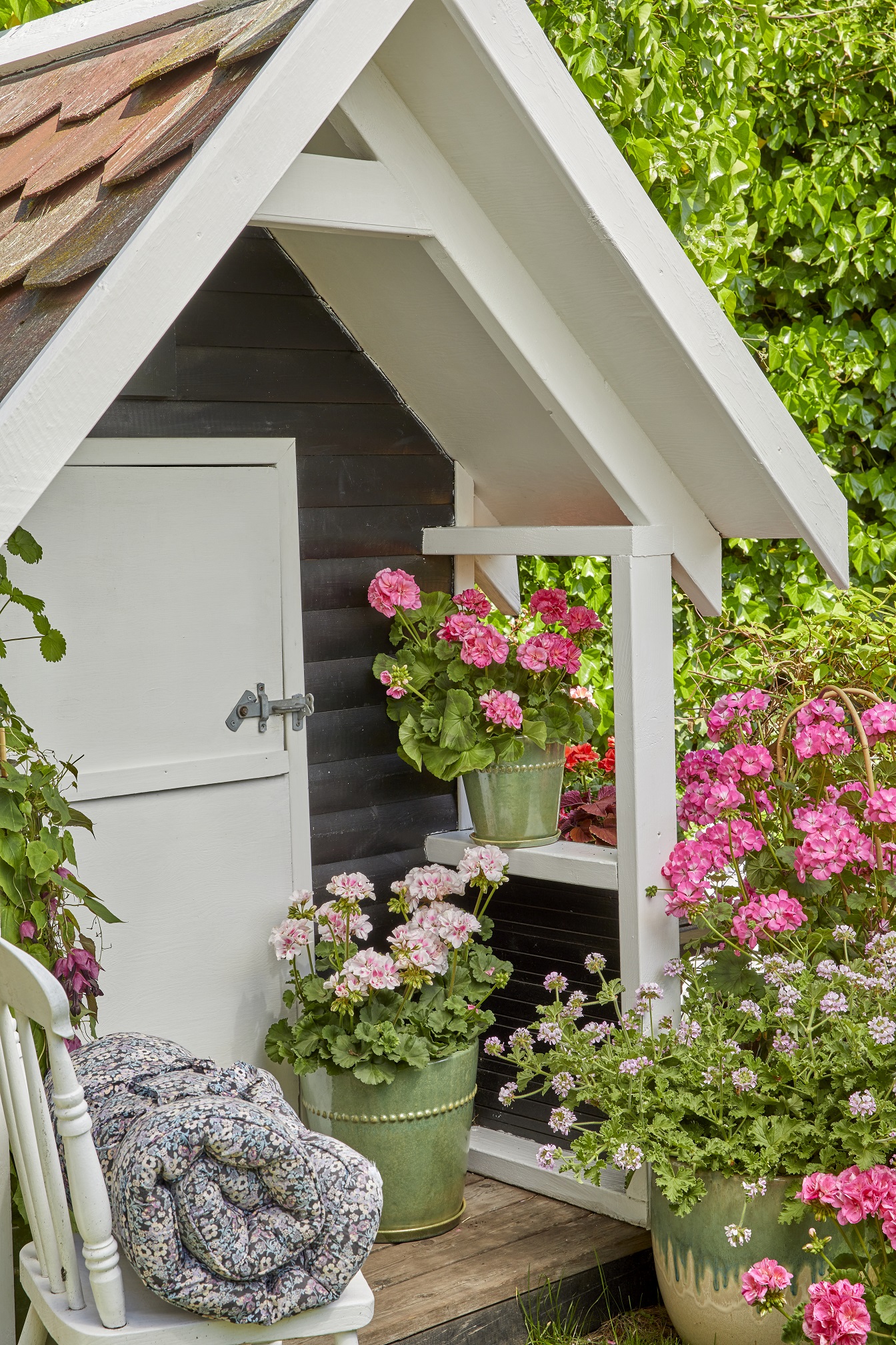 Ova mala ljetna kućica može savršeno poslužiti kao utočište. To je divno mjesto za opuštanje među prekrasnim cvjetnim pelargonijama.