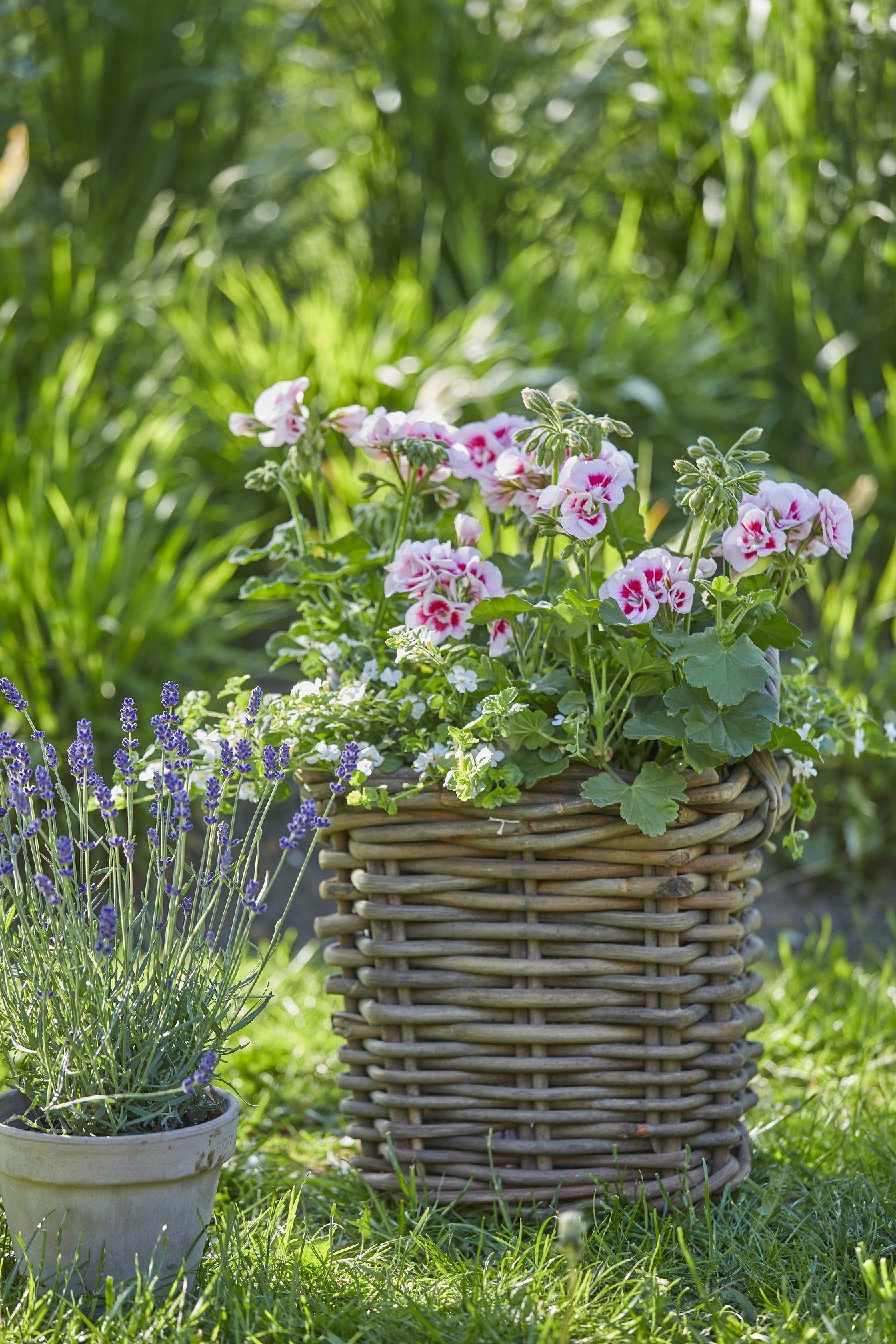 Okruženo bujnim zelenilom i šarenim cvjetovima, ovo romantično mjesto poziva vas na opuštanje. Mirisne pelargonije na drvenom zidu otpuštaju svoju intenzivnu aromu, a poglede mami i zasađeni aranžman pelargonija, lavande i Helichrysum petiolare (biljke slatkog korijena) na stolu.