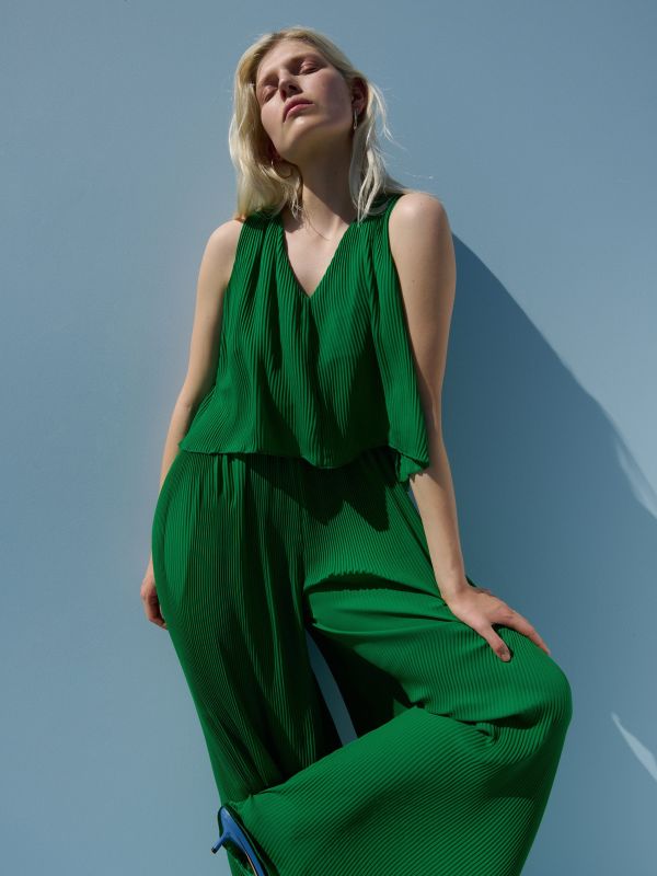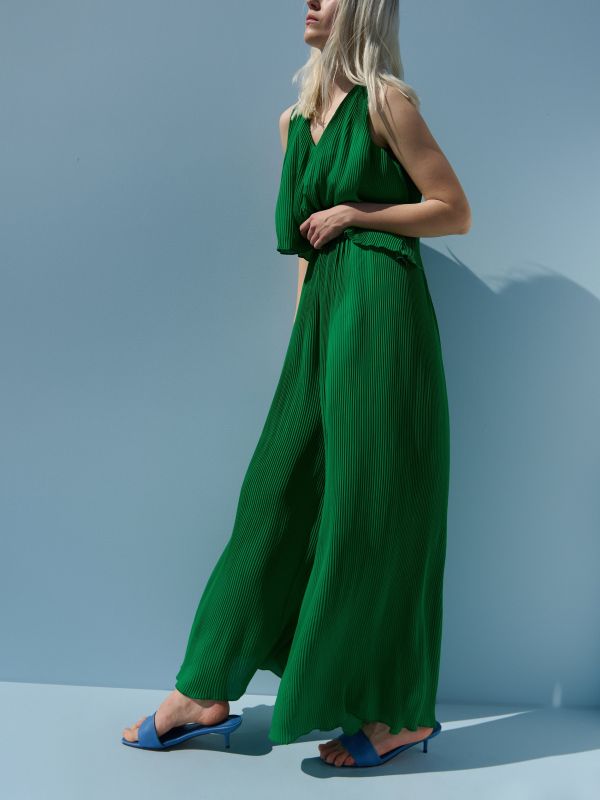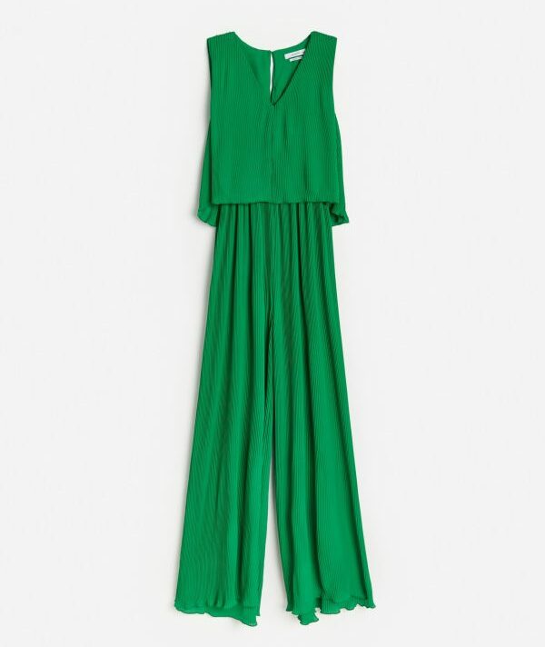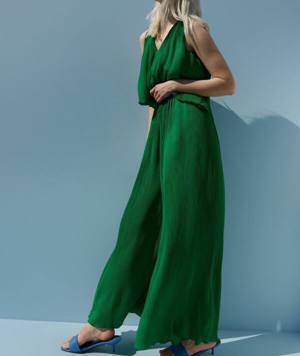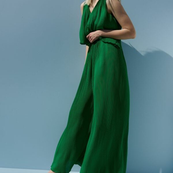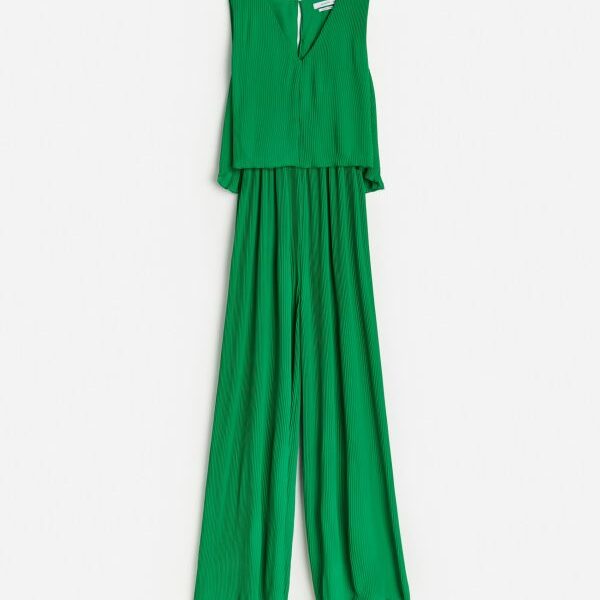 Zeleni kombinezon iz Reserveda najbolja je alternativa bilo kakvoj haljini. Lagan, udoban i lepršav, najbolji je odabir za vruće ljeto. Široke naramice i V-izrez daju dodatnu chic notu ovom kombinezonu. Materijal je 100 % poliester, a uz njegovu plisiranu tkaninu osjećat ćete se kao da nemate ništa na sebi.