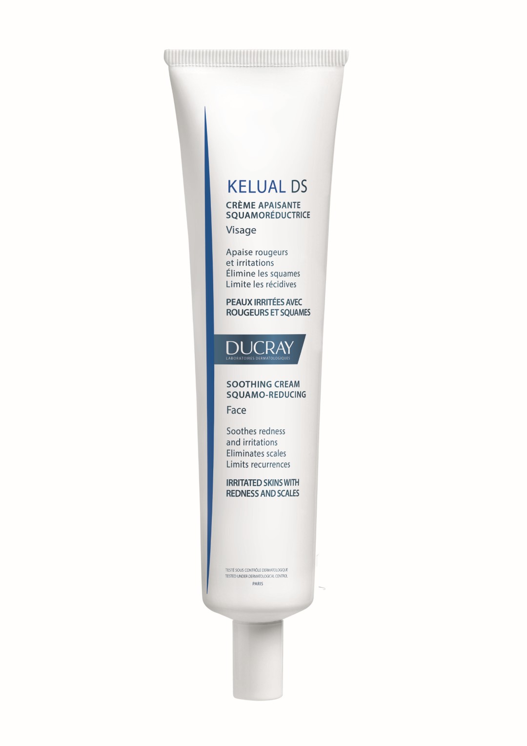 Kelual DS umirujuća krema za smanjenje ljusaka posebno je formulirana za njegu nadražene kože s lokaliziranim crvenilom i ljuskama na masnim predjelima na licu, rubu nosa, obrvama i rubu vlasišta. Potpuna formula umiruje crvenilo i nadražaj te uklanja ljuske i sprječava vraćanje pogoršanja: ß-gliciretična kiselina i bisabolol umiruju nadražaj i crvenilo, pitokton olaminin djeluje učinkovito protiv Malassezia gljivice, keluamid i glikolna kiselina uklanjaju nakupine ljusaka s površine kože, a sabal djeluje seboregulirajuće. Krema se u fazi intenzivnog tretmana nanosi dvaput dnevno (ujutro i navečer) tijekom 2 tjedna, a zatim se u fazi održavanja koristi dvaput tjedno. Djelotvornost kreme potvrđena je od strane korisnika; tako 80 posto ističe da krema umiruje nadražaj, svi ispitani potvrđuju da uklanja ljuske te svih 100 posto ispitanika ustvrdilo je poboljšanje nakon faze održavanja 100%.