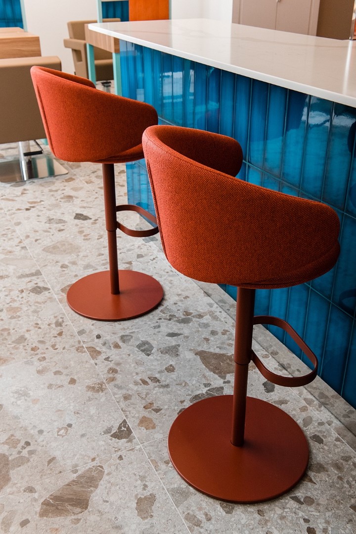 Čekaonica salona inspirirana je udobnošću dnevnog boravka i klijenticama pruža mogućnost korištenja tablet uređaja s Netflixom i drugim zabavnim sadržajem, a prostor ima i zaseban dio posvećen profesionalnim konzultacijama. Dio Karmella koji ga čini drukčijim od svih ostalih salona jest središnji bar u kojemu se klijentice mogu opustiti te naručiti svoje omiljeno piće ili delikatese iz probrane ponude. Tehnički dio salona sastoji se od otoka s osam radnih jedinica. Rollerball predstavlja dio za opuštanje prije pranja kose pod uređajem koji ubrzava i pospješuje proces koloracije, a ovaj kutak odiše i intimom londonske knjižnice. Color bar namijenjen je klasičnom pranju kose i samoj koloraciji dok je spa zona specijalizirana za posebno prilagođene masaže vlasišta i dubinske tretmane kose koji za sada kao takvi postoje jedino u Karmellu. Ovaj dio prostora potpuno je odvojen od ostatka, a iskustvo obogaćuju personalizirana glazbena lista, prigušena rasvjeta i ležeće stolice s funkcijom Shiatsu masaže.