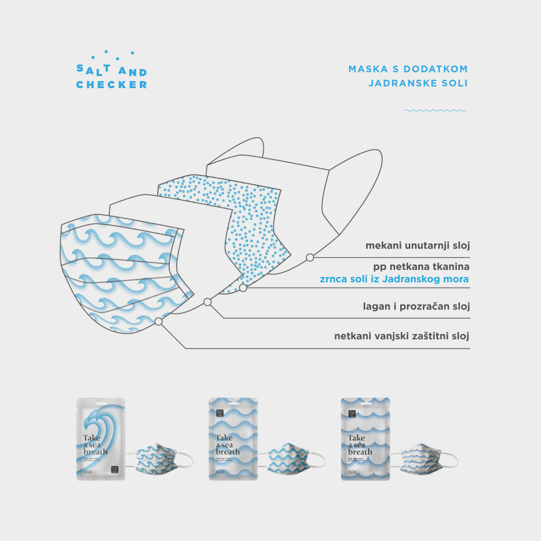 “Diši morski zrak” maska posebna je novost na tržištu! Riječ je o specijaliziranoj maski s jadranskom soli čiju posebnost čini sol koja se dobije iz jednog od najčišćih svjetskih mora, našeg Jadranskog mora. U vrijeme kada je svijet, zbog pandemije koronavirusa, preplavljen raznim zaštitnim maskama ova jedinstvena maska dodatno štiti organizam od onečišćenog zraka blagotvornim učinkom morske soli.