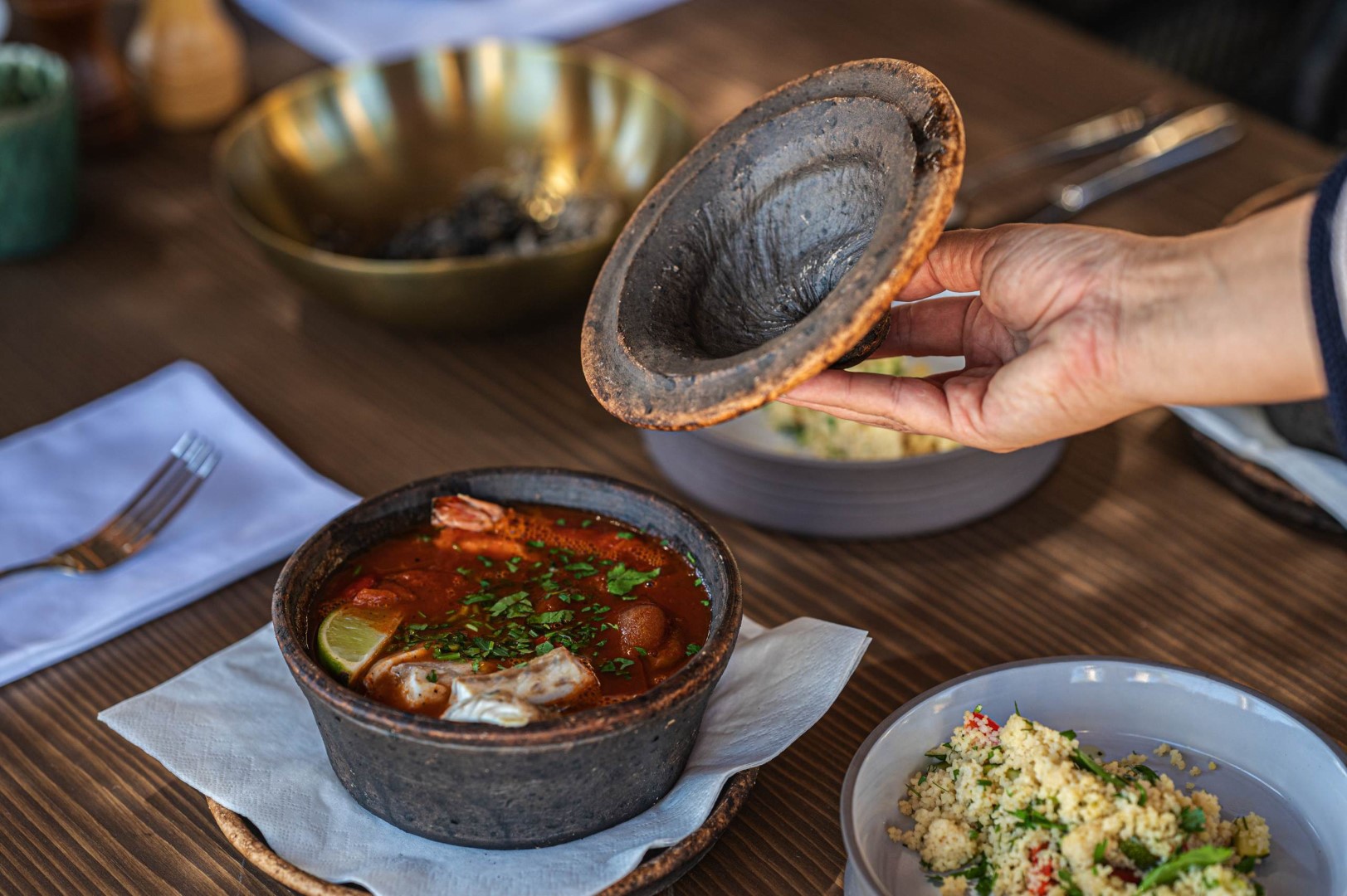 Srce iskustva Tattve upravo je restoran na otvorenom, koji nudi puno više od puke eksplozije okusa. Pokriven Khaimom, beduinskim šatorom ručno izrađenim u marokanskoj Sahari, u ovom će restoranu posjetitelji nahraniti i tijelo i dušu. Na jelovniku inspiriranom s pet elemenata, nalazi se sve što slavi paško tlo i more, kao i blagodati zdravih specijaliteta otoka Paga. Duboko ukorijenjena u lokalne tradicije prehrane, uz sastojke s tržnica otoka Paga, kuhinja predstavlja fuziju mediteranskih, bliskoistočnih i sjevernoafričkih elemenata poput bogate berberske plate, ribljeg tanginea s cucusom te paganskog burgera.