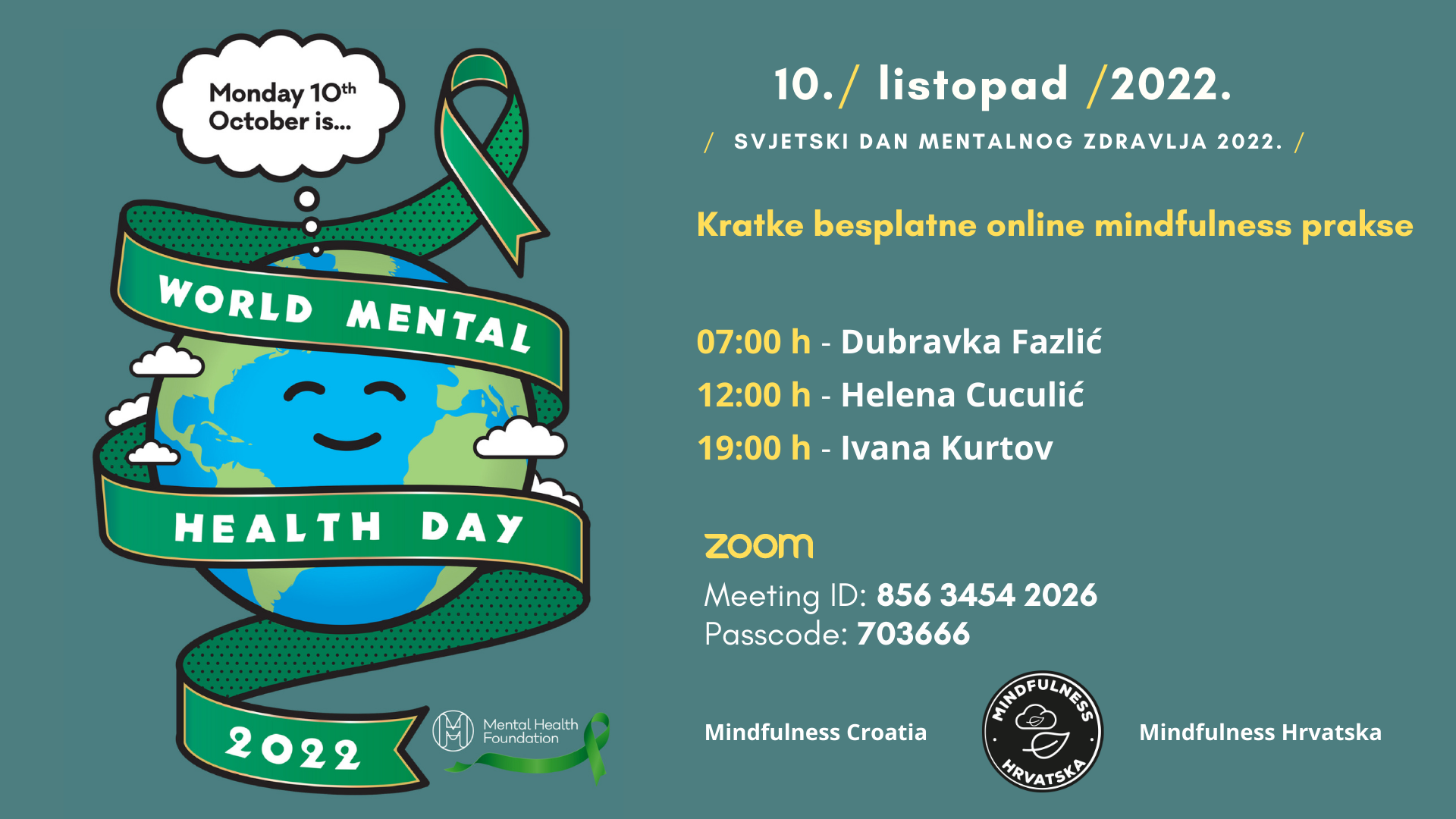 Na Svjetski dan mentalnog zdravlja, u ponedjeljak 10. listopada 2022., Mindfulness Hrvatska organizira kratke besplatne online mindfulness prakse.