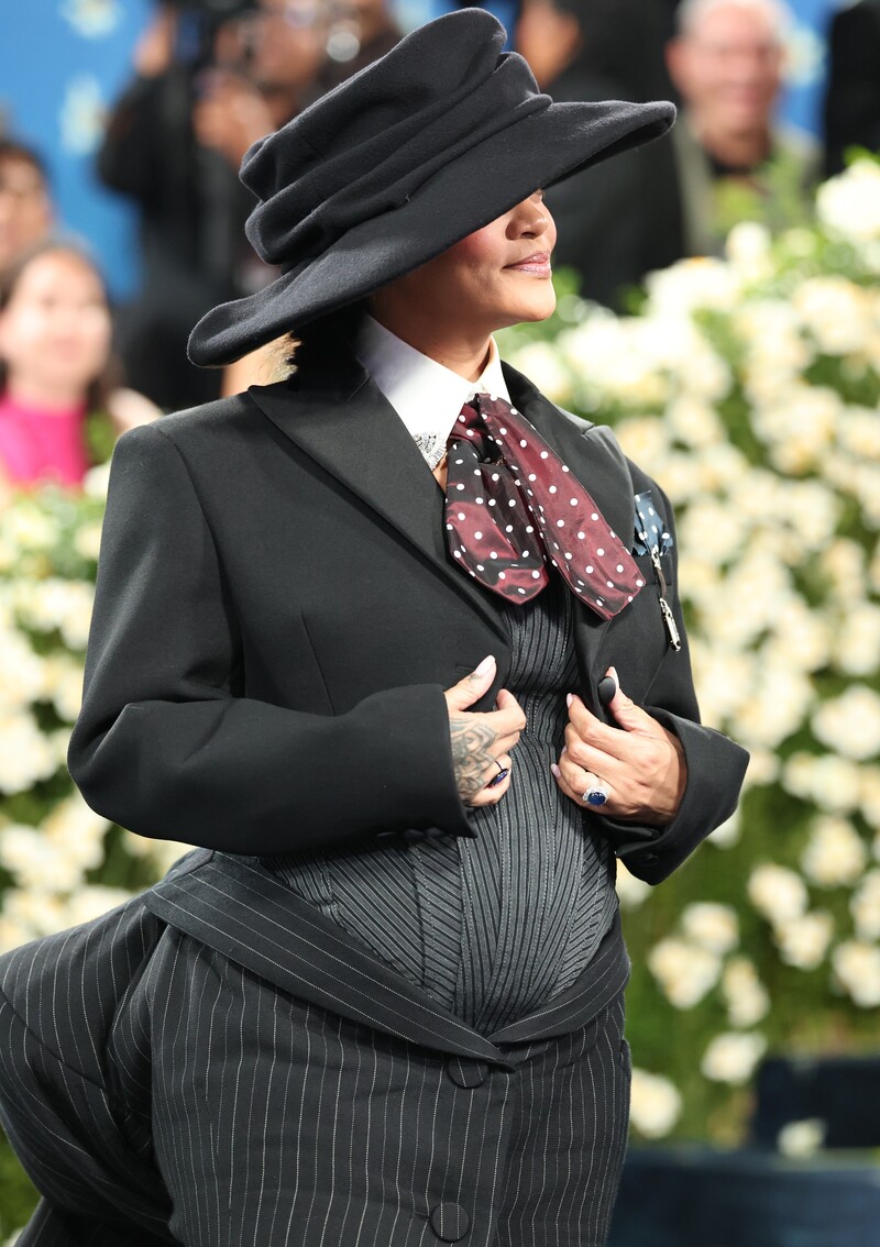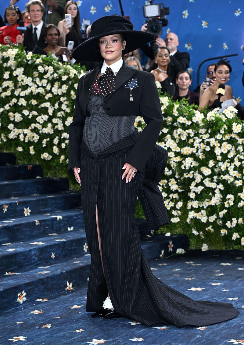 Na samoj Gali, Rihanna je zablistala u neobičnoj kreaciji Marca Jacobsa, a u središtu pozornosti bio je, naravno, trbuh koji je prekrila vunenim korzetom. Pjevačica je kombinaciju upotpunila dramatičnim šeširom, prugastom suknjom, kratkim sakoom i štiklama. Rihanna se u svojoj kreaciji savršeno uklopila u ovogodišnju temu izložbe “Superfine: Tailoring Black Style” te dress code “Tailored for you”, u kojem je naglasak bio na krojene komade, mušku modu i afroameričku kulturu.