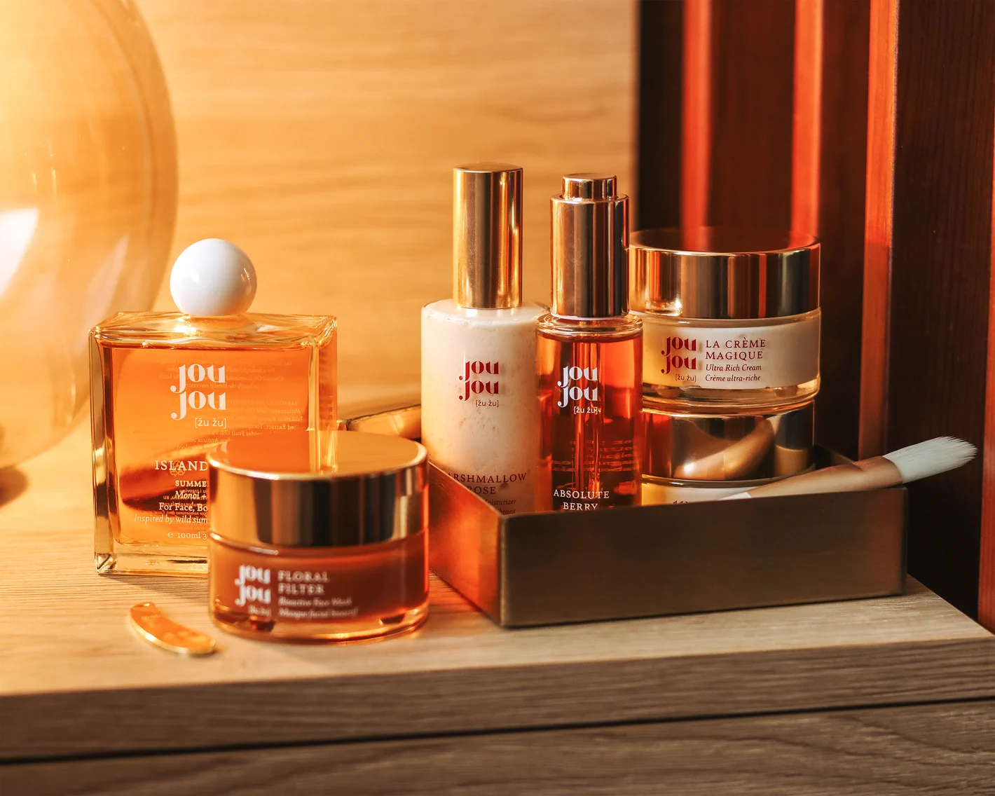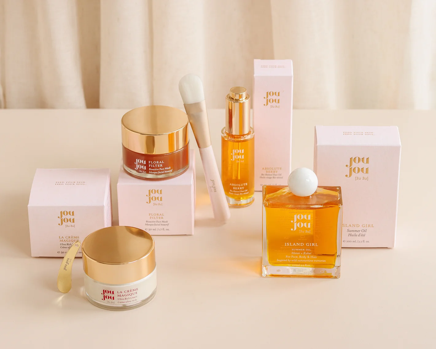 Brend JouJou strastveno kombinira botaničku mudrost i znanstvenu stručnost kako bi ponudio organsku njegu koja obnavlja kožu. Svi proizvodi JouJou brenda su prirodni, nisu testirani na životinjama, pažljivo pakirani u staklene bočice i ručno izrađeni. JouJou potiče korisnike na duboko duhovno iskustvo ljubavi, njege i zadovoljstva kroz svakodnevni ritual njege kože te igra ključnu ulogu u podizanju svijesti o važnosti očuvanja okoliša.