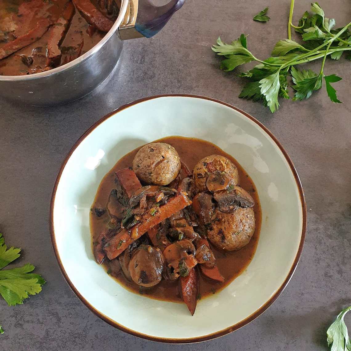 “Seitan, kojeg svatko može i sam napraviti kod kuće, izvrstan je u jelima koja se dulje kuhaju, posebice u onima koja imaju gust umak. Ovaj je takav, gust, pun okusa i savršeno nadopunjava okruglice od kruha koje su neizbježan klasik u ručkovima“, poručio nam je ovog puta Matei s bloga Plant-based Full of Taste.