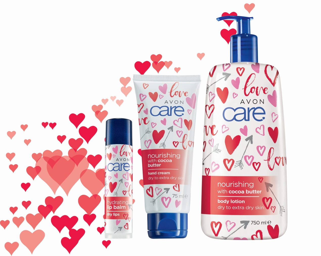 Avon Care omiljena je obiteljska linija za njegu kože, ovaj put u valentinovskom ruhu: krema za ruke i losion za tijelo upotpunjeni balzamom za usne njegovat će vašu kožu, a svojim preslatkim pakiranjem izmamiti zaljubljeni uzdah baš svaki put kad krenete s korištenjem.