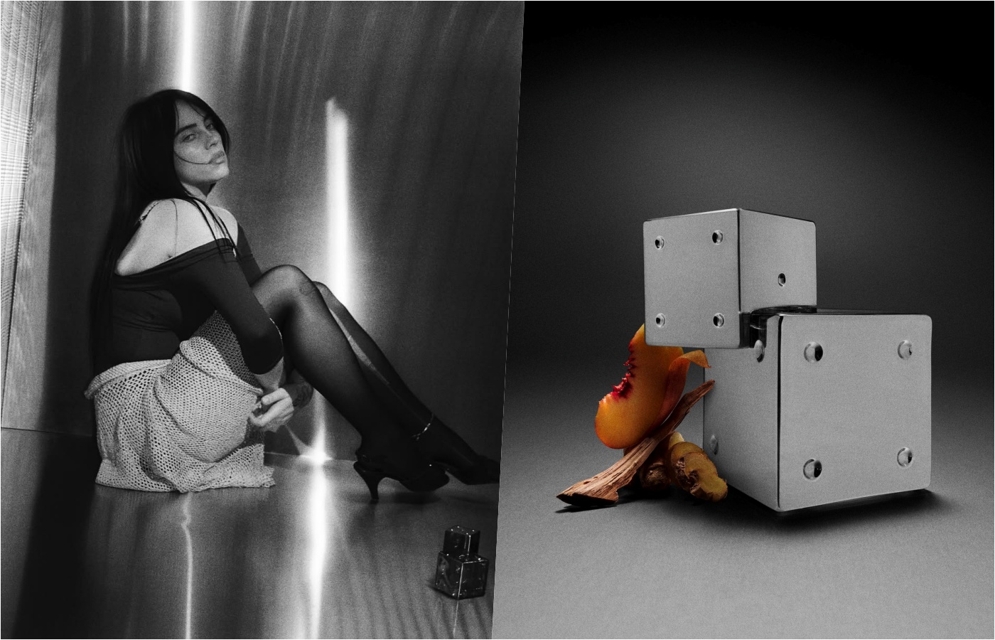 Na crno-bijelim fotografijama iz kampanje Billie Eilish pozira u grunge, no ženstenom izdanju. Možemo vidjeti pjevačicu kako sjedi na podu odjevena u majicu s ogoljenim ramenima, pletenu mini suknju i poderane crne najlonke ispod kojih se naziru flasteri na nogama.