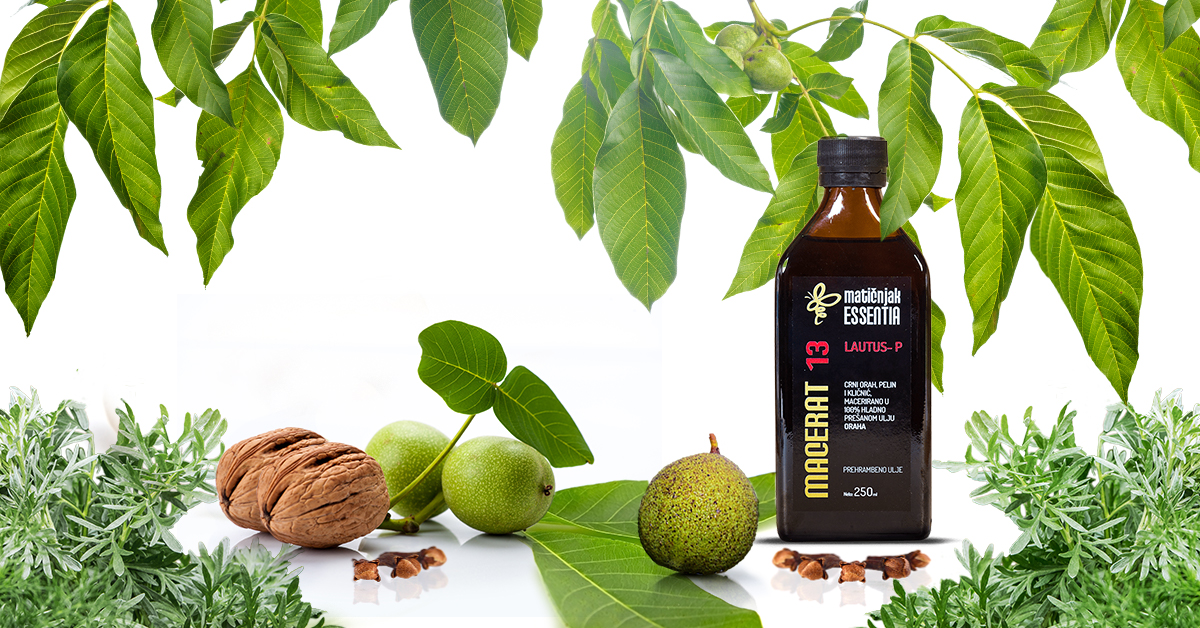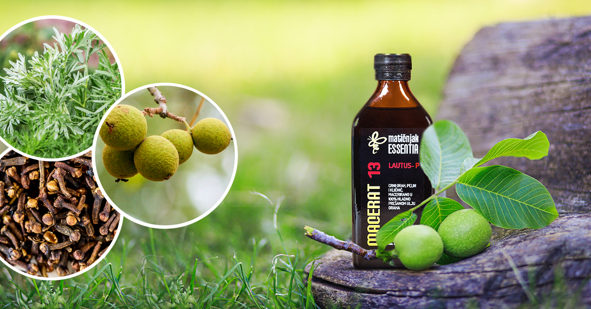 Macerat 13 Lautus u ulju oraha, savršen je saveznik u borbi protiv parazita. Pelin, klinčić i crni orah macerirani u 100 % hladnoprešanom ulju oraha daju proizvod koji je prije svega nježan i djelotvoran. Pelin je biljka koja je izrazito moćna kad su u pitanju paraziti, a crni orah se već stoljećima koristi protiv gljivica i parazita koji uzrokuju bolesti kože. Orahovo ulje sadrži visoku biološku vrijednost (visok sadržaj polinezasićenih masnih kiselina), stoga snižava kolesterol i trigliceride te povoljno djeluje na mozak i štitnu žlijezdu. Što se tiče klinčića, riječ je o jedinstvenoj biljci koja sadrži eugenol (najmoćniju antimikrobnu tvar), koja ubija protozoe (najsitnije oblike organizama) i jedino je prirodno sredstvo koje uništava jajašca parazita.