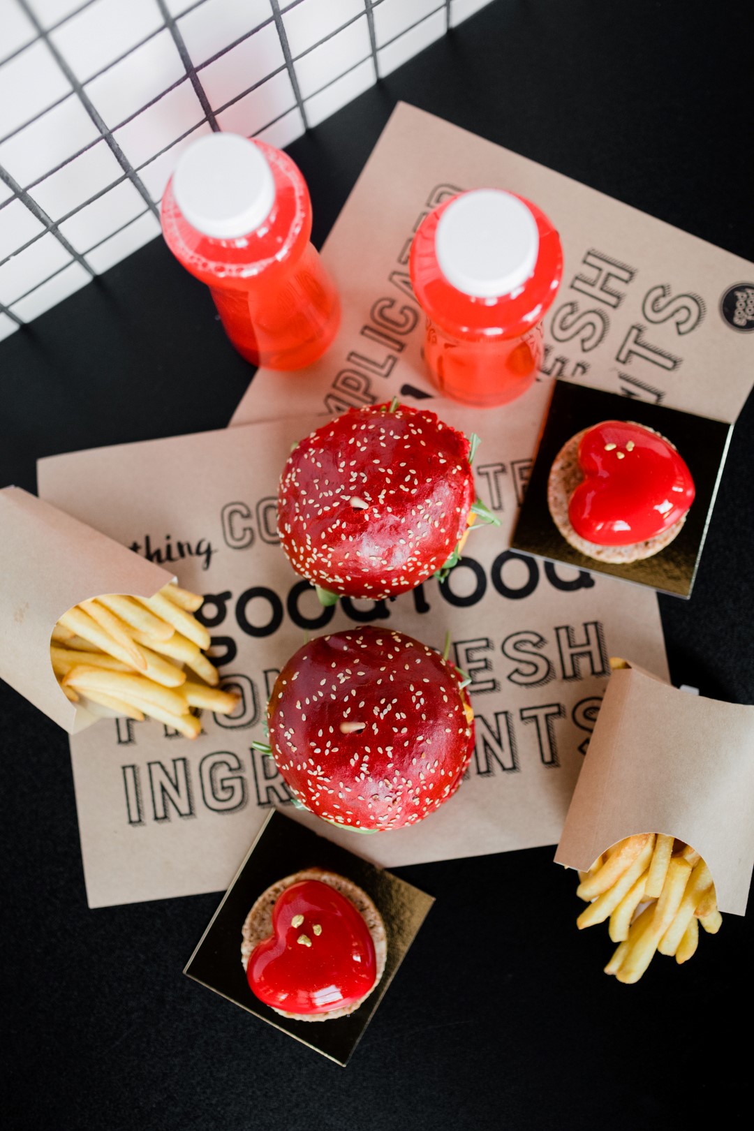 Tako je Good Food osmislio meni za dvoje koji se sastoji od burgera, krumpirića, osvježavajućeg voćnog napitka i fantastičnog deserta. Poseban twist predstavlja crvena boja, boja ljubavi, koja se provlači kroz cijeli meni. Tako je pecivo burgera u efektnoj crvenoj boji, kao i osvježavajući napitak te desert u obliku srca preliven crvenom glazurom. Možete se opredijeliti za Avocado Chic(k) burger, fenomenalnu kombinaciju hrskave piletine, avokada i umaka od manga ili za Double Trouble s junećom pljeskavicom, prženom pancetom i prženim lukom.
