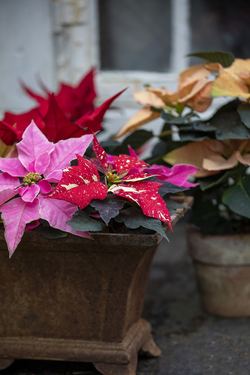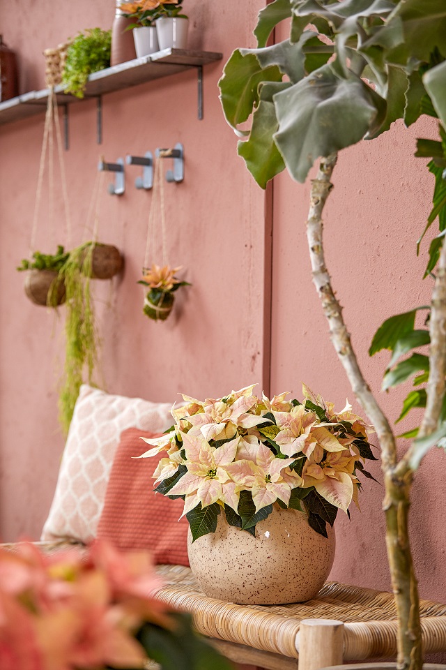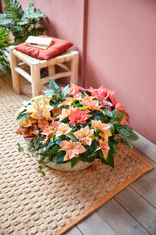 Iznad: Velika posuda s mini božićnim zvijezdama boje marelice, ružičaste boje i boje lososa, puzajućom prugastom tradeskancijom, begonijom s lišćem boje hrđe i kalatejom koje su zimi u samom centru zbivanja. Kombinacija božićnih zvijezda i ukrasnog lišća dobro se slaže s drugim sobnim biljkama.