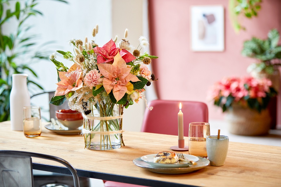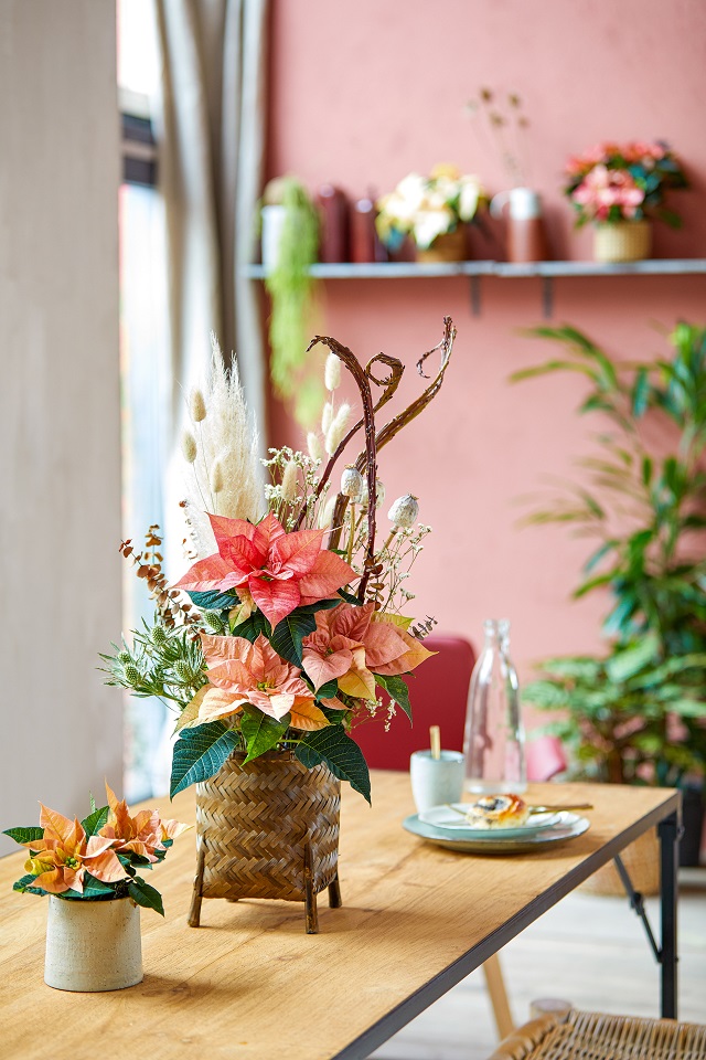 U buketu na slici iznad božićne zvijezde kombinirane su s karanfilima, glavicama maka, staticom, čičkom (eryngium), raznim vrstama ukrasnih trava i granama ariša. Neki od cvjetnih elemenata postavljeni su s vanjske strane jednostavne staklene vaze te pričvršćeni elastičnim trakama i vunom.